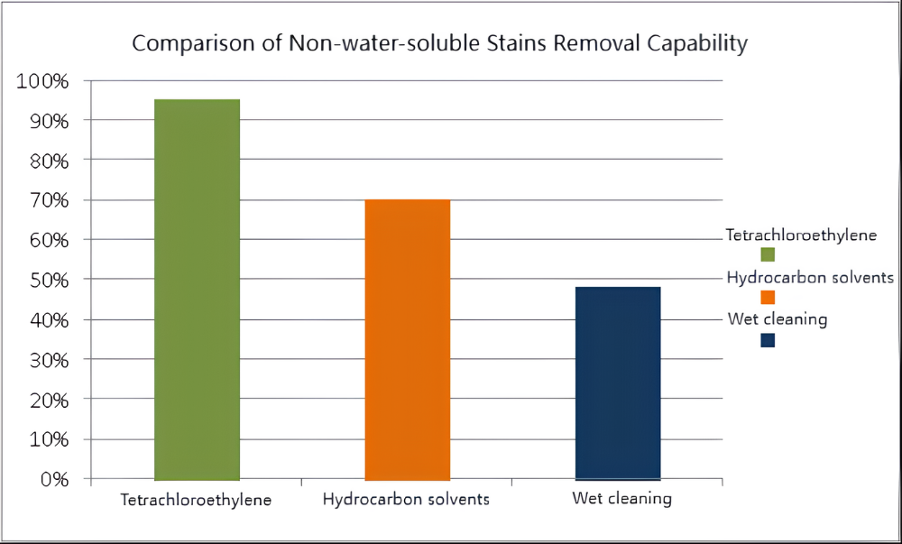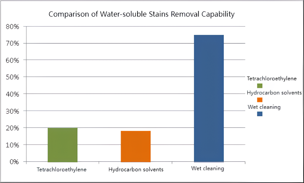ウェットクリーニングは水溶性の汚れを除去する能力が最も高く、その除去率は 75% に達し、テトラクロロエチレンと炭化水素溶剤がそれに続きます。