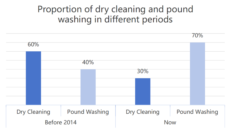 10年前、ドライクリーニングとポンド洗濯の割合は約6:4でした。しかし、現在ではドライクリーニングとポンド洗いの比率は3:7程度となっています。